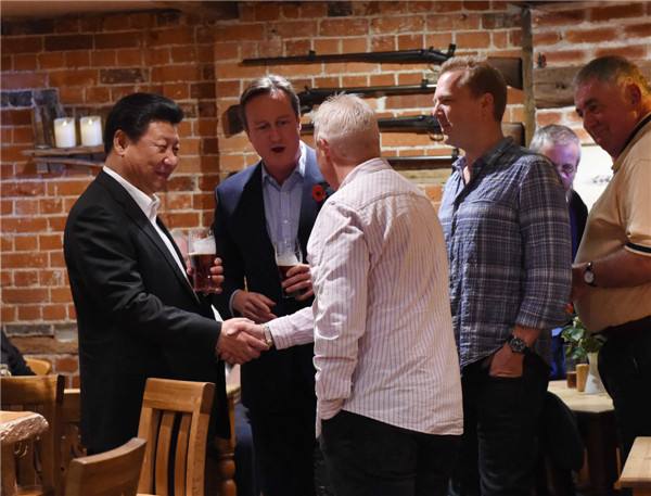 10月22日,國(guó)家主席習(xí)近平在契克斯首相鄉(xiāng)間別墅同英國(guó)首相卡梅倫再次會(huì)晤。會(huì)晤結(jié)束后,習(xí)近平在卡梅倫陪同下乘車前往當(dāng)?shù)匦℃?zhèn)體驗(yàn)酒吧文化。(新華社記者饒愛民攝)