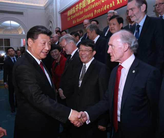 習近平在致辭中指出,多年來,孔子學院和孔子課堂的教職工為介紹中華文化、溝通人民心靈、搭建友誼橋梁傾注了大量熱情和心血,取得了可喜成績??吹接羞@么多老師和學生在教授和學習漢語,尤其看到有這么多英國學生對中國語言文化感興趣,我感到很高興。