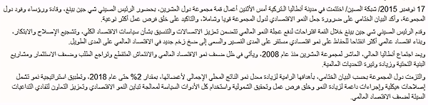 昨日,二十國(guó)集團(tuán)領(lǐng)導(dǎo)人第十次峰會(huì)在土耳其安塔利亞閉幕。中國(guó)領(lǐng)導(dǎo)人習(xí)近平期間出席了峰會(huì),并發(fā)表題為《創(chuàng)新增長(zhǎng)路徑 共享發(fā)展成果》的重要講話(huà),其中強(qiáng)調(diào)二十國(guó)集團(tuán)要加強(qiáng)宏觀(guān)經(jīng)濟(jì)政策溝通和協(xié)調(diào),推動(dòng)改革創(chuàng)新,構(gòu)建開(kāi)放型世界經(jīng)濟(jì)。
