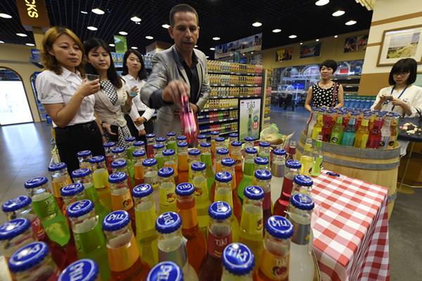 2015年6月8日,中東歐國(guó)家特色商品館在浙江寧波開館。圖為一位塞爾維亞商人在寧波中東歐國(guó)家特色商品館向參觀者展示商品。(新華社記者鞠煥宗攝)