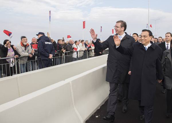 2014年12月18日,李克強(qiáng)總理與塞爾維亞總理武契奇共同出席貝爾格萊德跨多瑙河大橋竣工儀式。這是李克強(qiáng)與武契奇在儀式現(xiàn)場(chǎng)向民眾揮手致意。(新華社記者黃敬文攝)