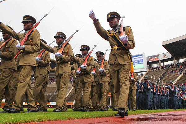 2015年4月18日,在中國援建的津巴布韋國家體育場內(nèi),津國防軍進(jìn)行表演。(新華社發(fā),費(fèi)列蒙攝)