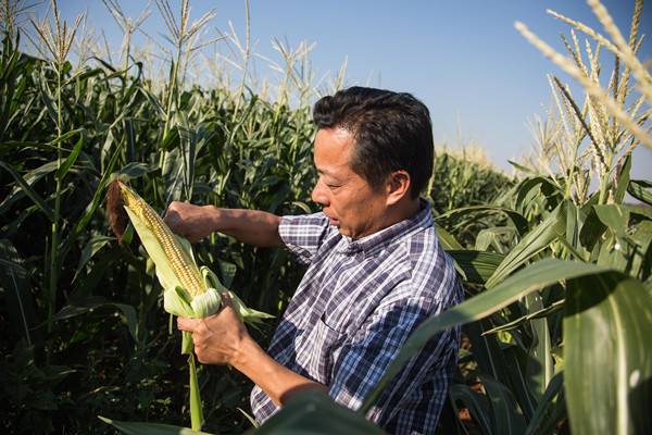 2015年11月11日,在津巴布韋奇諾伊的溫亞尼農(nóng)場上,中方企業(yè)晥津公司總經(jīng)理何宏順展示農(nóng)場出品的青玉米。(新華社記者許林貴攝)