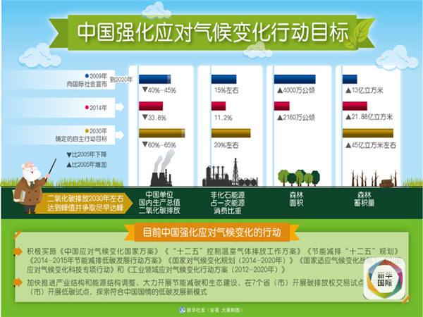 今年6月,中國正式向聯合國提交2020年后應對氣候變化的“國家自主決定貢獻”:二氧化碳排放2030年左右達到峰值并爭取盡早實現,單位國內生產總值二氧化碳排放比2005年下降60%至65%,非化石能源占一次能源消費比重達到20%左右,森林蓄積量比2005年增加45億立方米左右。