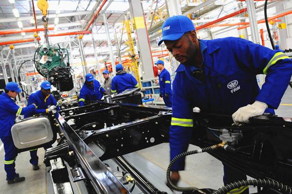 2014年7月10日,中國第一汽車集團在南非東開普省曼德拉灣市舉行南非庫哈工廠落成及首輛機車下線儀式。圖為工人在中國一汽南非工廠生產線上工作。 (新華社記者張川石攝)