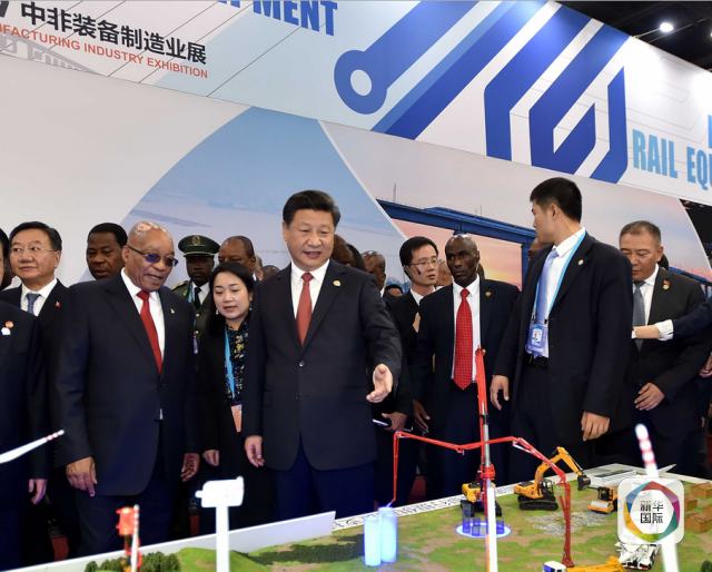 12月4日,國家主席習(xí)近平在約翰內(nèi)斯堡同南非總統(tǒng)祖馬,非盟輪值主席、津巴布韋總統(tǒng)穆加貝共同出席中非裝備制造業(yè)展開幕式并為展覽剪彩。(新華社記者李濤攝)