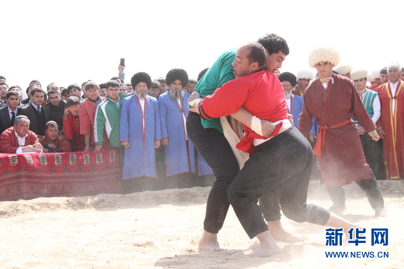 3月21日,在土庫(kù)曼斯坦首都阿什哈巴德,現(xiàn)場(chǎng)進(jìn)行摔跤比賽。新華社記者盧敬利 攝
