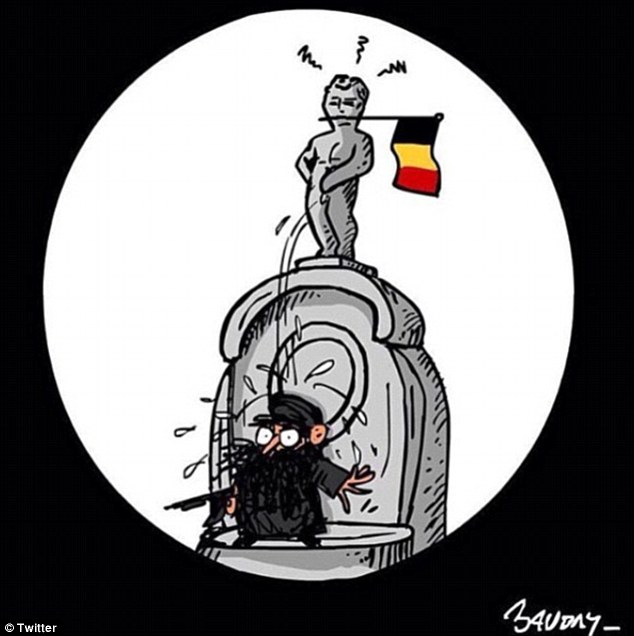 眾所周知,“撒尿小童”(Manneken Pis)是布魯塞爾廣場(chǎng)的標(biāo)志性建筑,也是游客必游的景點(diǎn)。有網(wǎng)友就借此制作漫畫,展示對(duì)恐怖主義的藐視。