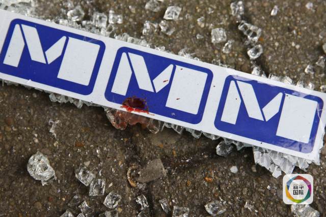 這是3月22日在比利時首都布魯塞爾馬埃勒貝克地鐵站一個出口處拍攝的沾有血滴的地鐵標(biāo)志。 新華社記者葉平凡攝