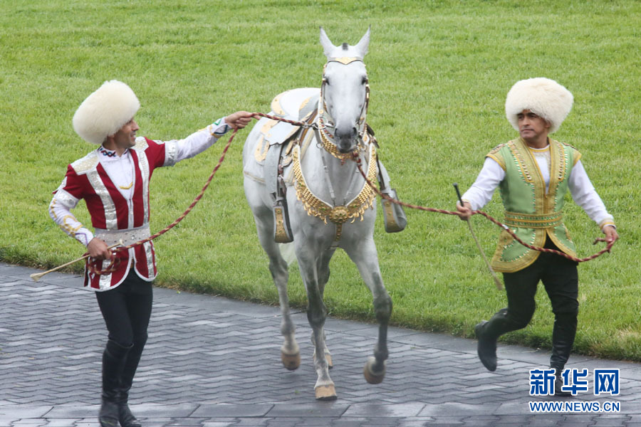 當(dāng)日,土庫曼斯坦為慶祝阿哈爾捷金馬(中國稱汗血馬)節(jié)在總統(tǒng)馬場舉行汗血馬選美大賽。一匹名為“別格汗”的8歲鼠灰色馬受到評委們的青睞,贏得2016年度“最美汗血馬”稱號。新華網(wǎng)記者 盧敬利 攝