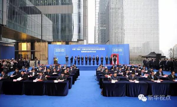 (1月8日,中新重慶戰(zhàn)略性互聯(lián)互通示范項(xiàng)目管理局揭牌,首批合作項(xiàng)目簽約。新華社記者唐奕 攝)