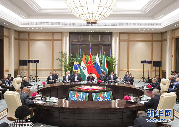 第一,共同創(chuàng)新增長方式。要抓住中方推動(dòng)制定二十國集團(tuán)創(chuàng)新增長藍(lán)圖的契機(jī),加快實(shí)施創(chuàng)新驅(qū)動(dòng)發(fā)展戰(zhàn)略,保持總需求擴(kuò)大力度,深化結(jié)構(gòu)性改革,改造提升傳統(tǒng)比較優(yōu)勢,提升中長期增長潛力。要認(rèn)真落實(shí)去年烏法會(huì)晤通過的《金磚國家經(jīng)濟(jì)伙伴戰(zhàn)略》,開創(chuàng)貿(mào)易投資大融合、貨幣金融大流通、基礎(chǔ)設(shè)施大聯(lián)通、人員文化大交流的新局面,形成優(yōu)勢互補(bǔ)、增長聯(lián)動(dòng)的強(qiáng)大合力。