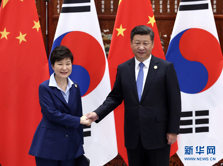 9月5日,國家主席習(xí)近平在杭州會見來華出席二十國集團領(lǐng)導(dǎo)人峰會的韓國總統(tǒng)樸槿惠。 新華社記者張鐸攝
