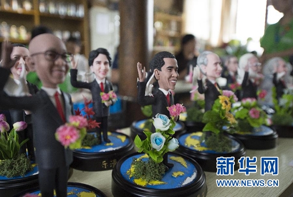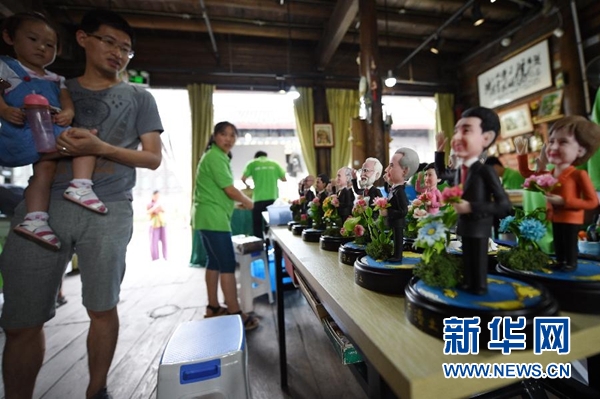 9月1日,手工藝人吳小莉創(chuàng)作的捏塑作品G20杭州峰會(huì)參會(huì)領(lǐng)導(dǎo)人形象在杭州京杭大運(yùn)河畔的橋西歷史街區(qū)擺放展示。新華社記者 鞠煥宗 攝