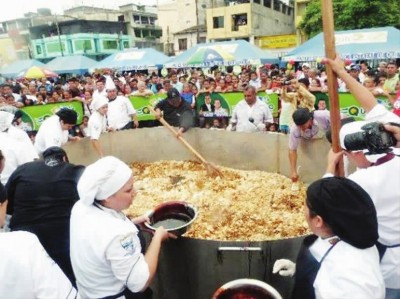 克韋多市作為“炒冷飯”的故鄉(xiāng),為了推廣國內和國際旅游,在2013年還曾做過一個世界最大的“炒冷飯”。當時使用的鍋直徑4米,深1.5米,使用的食材有500公斤大米、1000個雞蛋、50升油、三大桶醬油,還有上百公斤的雞肉、蝦仁等,40多名廚師學校的學生一起參與了制作?,F(xiàn)場數(shù)千民眾隨后一起享用了這個巨無霸“炒冷飯”。