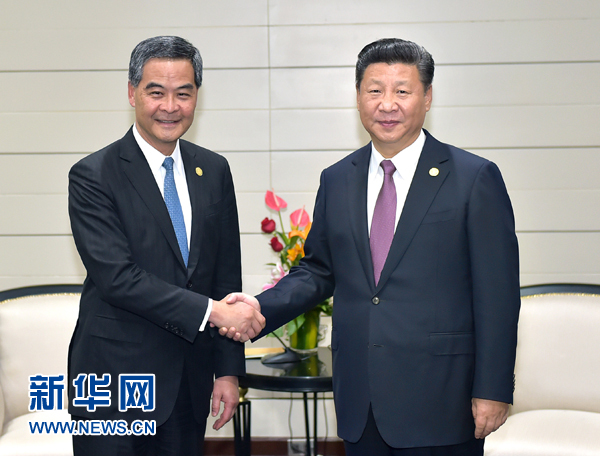 11月20日,國家主席習近平在秘魯首都利馬會見前來出席亞太經(jīng)合組織第二十四次領(lǐng)導(dǎo)人非正式會議的香港特別行政區(qū)行政長官梁振英。新華社記者 李濤 攝