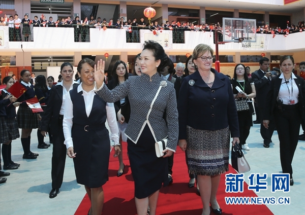 彭麗媛抵達(dá)時(shí),秘魯總統(tǒng)夫人蘭格和學(xué)校校長在停車處迎接,師生們揮舞中秘兩國國旗,在操場夾道歡迎中國貴賓。學(xué)生樂隊(duì)奏起中國經(jīng)典樂曲《茉莉花》。