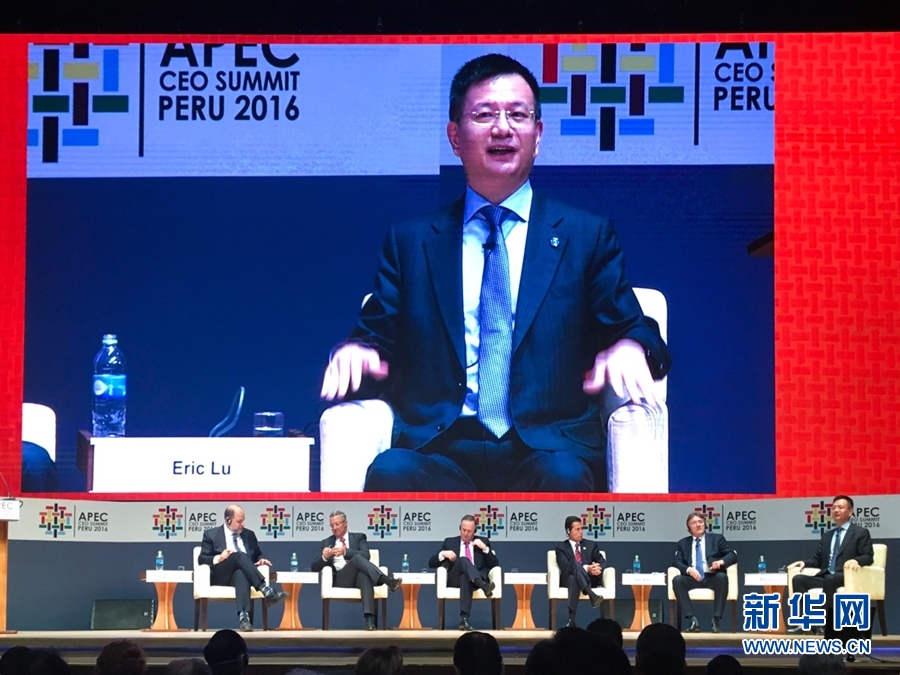 ????當(dāng)?shù)貢r間11月19日,APEC工商領(lǐng)導(dǎo)人峰會舉行主題為“重新設(shè)計貿(mào)易”的現(xiàn)場討論會。圖為聚貿(mào)電子商務(wù)有限公司董事長陸宏翔在討論會上發(fā)言。