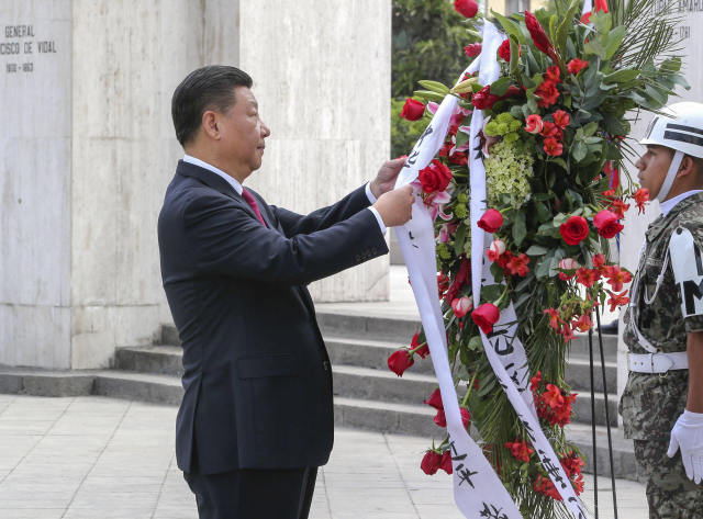 11月21日,國家主席習近平在利馬同秘魯總統(tǒng)庫琴斯基舉行會談。會談前,在庫琴斯基夫婦陪同下,習近平和彭麗媛向秘魯獨立先驅(qū)紀念碑敬獻花圈。(新華社記者 丁林 攝)
