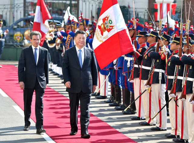 11月21日,國家主席習近平在利馬會見秘魯國會主席薩爾加多。習近平抵達國會時,軍樂隊奏歡迎曲。習近平檢閱儀仗隊。(新華社記者 李濤 攝)
