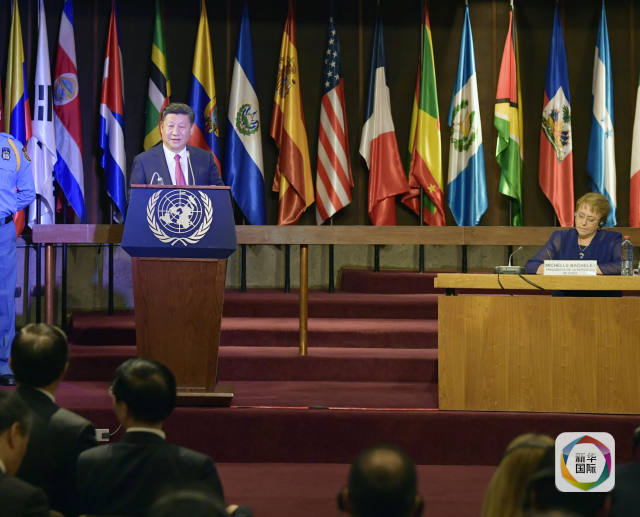 國(guó)家主席習(xí)近平在圣地亞哥聯(lián)合國(guó)拉丁美洲和加勒比經(jīng)濟(jì)委員會(huì)總部出席中拉媒體領(lǐng)袖峰會(huì)開(kāi)幕式。智利總統(tǒng)巴切萊特陪同出席。在熱烈的掌聲中,習(xí)近平發(fā)表題為《開(kāi)創(chuàng)中拉媒體合作新局面》的致辭。(新華社記者王曄攝)