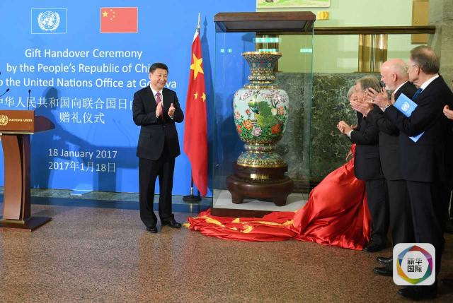 ——向萬(wàn)國(guó)宮贈(zèng)送景泰藍(lán)瓶。萬(wàn)國(guó)宮一層大廳內(nèi),習(xí)主席和古特雷斯共同為名為“盛世歡歌”的景泰藍(lán)瓶揭幕。
