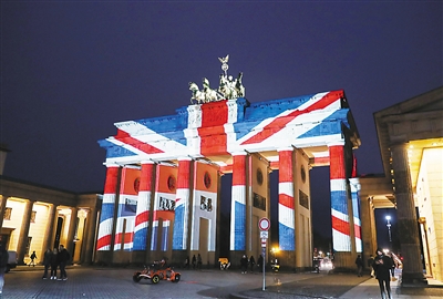 3月23日,在德國首都柏林,英國國旗樣式的彩燈點(diǎn)亮勃蘭登堡門,悼念英國倫敦恐怖襲擊事件中的遇難者。 新華社記者 單宇琦攝