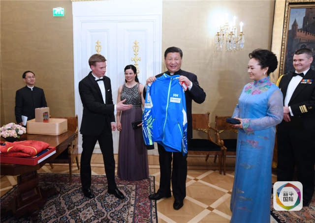 當(dāng)?shù)貢r間4月5日晚,國家主席習(xí)近平和芬蘭總統(tǒng)尼尼斯托在赫爾辛基共同會見剛剛參加完2017年世界花樣滑冰錦標(biāo)賽的中芬兩國冰雪運(yùn)動員代表。習(xí)近平夫人彭麗媛和尼尼斯托夫人豪吉?dú)W參加會見。這是芬蘭運(yùn)動員向習(xí)近平和夫人彭麗媛贈送運(yùn)動衣。新華社記者饒愛民攝