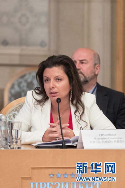 7月4日,“今日俄羅斯”電視臺總編輯西蒙尼揚(yáng)在第三屆中俄媒體論壇上發(fā)言。新華社記者 吳壯 攝