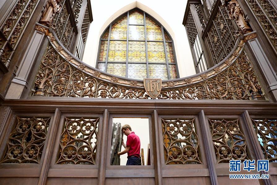 德國管風琴修理師弗朗茨·羅思在進行卡薩翁內(nèi)部維修工作(10月23日攝)。 100年前,它誕生在美國波士頓,轟動一時,成為北美四大名琴之一。然而,歷史的變遷中,它一度傷痕累累,無法再發(fā)聲。新華社記者 姜克紅攝