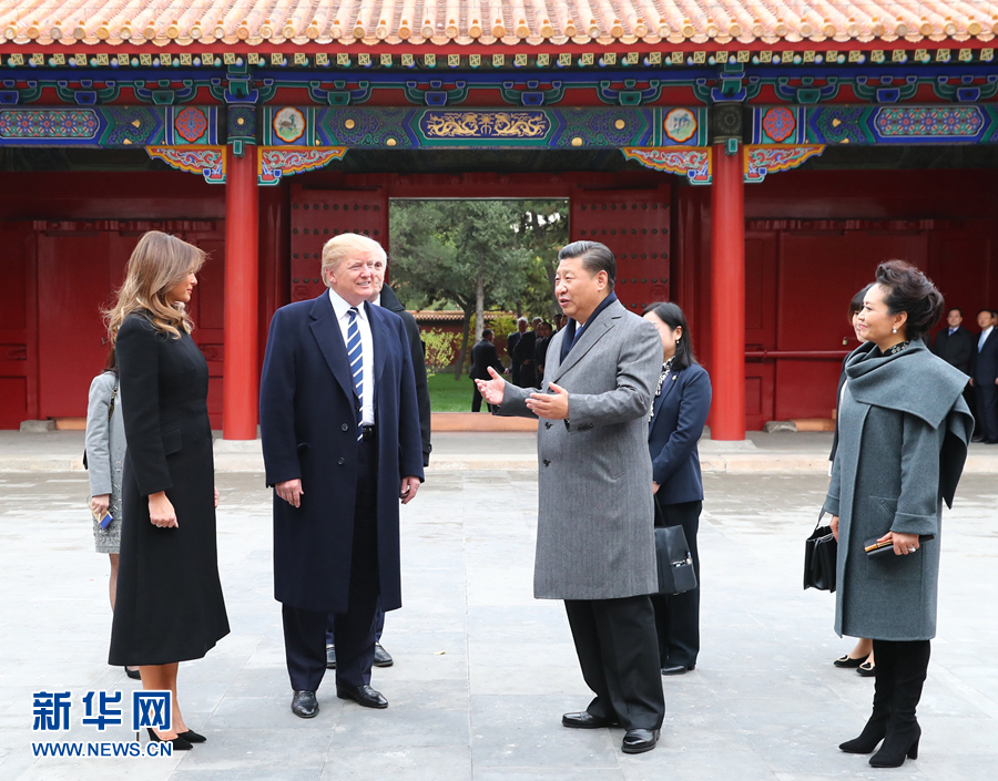 11月8日下午,國家主席習(xí)近平和夫人彭麗媛在北京故宮博物院迎接來華進(jìn)行國事訪問的美國總統(tǒng)特朗普和夫人梅拉尼婭。兩國元首夫婦在寶蘊樓簡短茶敘。新華社記者 謝環(huán)馳 攝