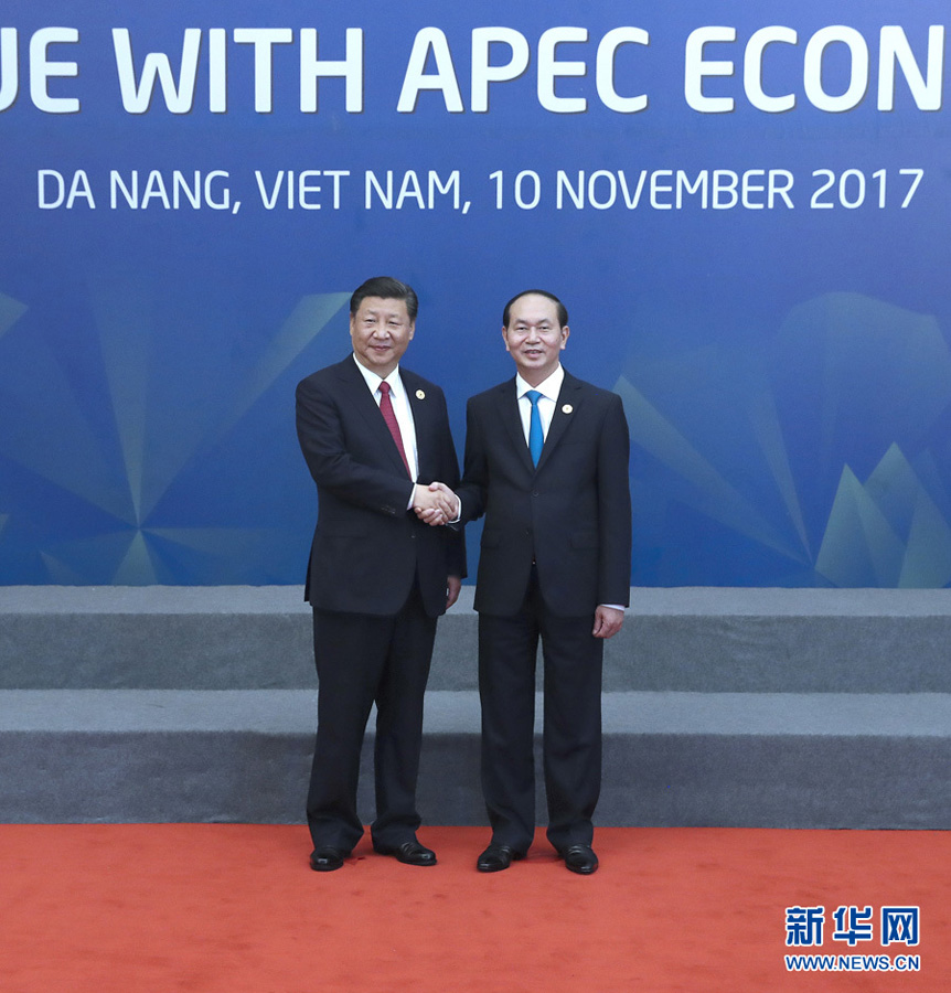 11月10日,國(guó)家主席習(xí)近平在越南峴港出席亞太經(jīng)合組織領(lǐng)導(dǎo)人同工商咨詢理事會(huì)代表對(duì)話會(huì)。這是對(duì)話會(huì)開始前,習(xí)近平受到越南國(guó)家主席陳大光的迎接。新華社記者 馬占成 攝