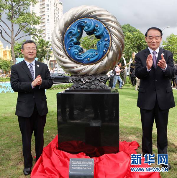 11月9日,在越南峴港APEC公園,中國外交部副部長李保東(右)、商務(wù)部副部長王受文(左)共同為中國贈送的雕塑作品《和夢同圓》揭幕。作為2017年亞太經(jīng)合組織(APEC)領(lǐng)導(dǎo)人會議周的一部分,越南峴港APEC公園9日正式開放,展示21個成員經(jīng)濟(jì)體藝術(shù)家創(chuàng)作的雕塑。新華社記者李鵬攝