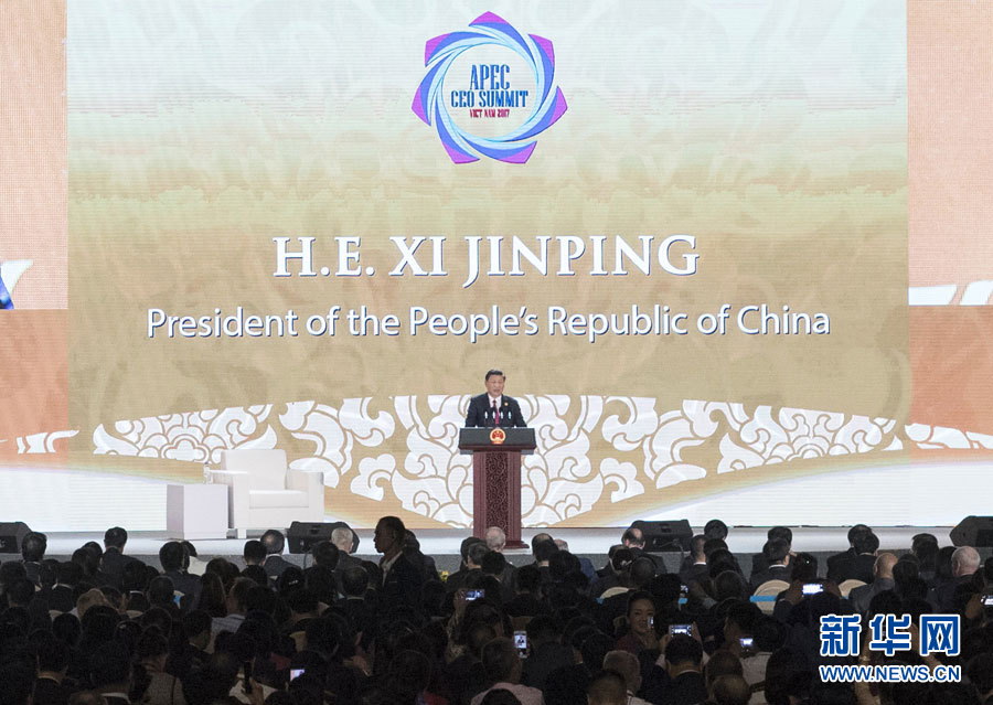 11月10日,國家主席習(xí)近平應(yīng)邀出席在越南峴港舉行的亞太經(jīng)合組織工商領(lǐng)導(dǎo)人峰會(huì)并發(fā)表題為《抓住世界經(jīng)濟(jì)轉(zhuǎn)型機(jī)遇 謀求亞太更大發(fā)展》的主旨演講。新華社記者 王曄 攝