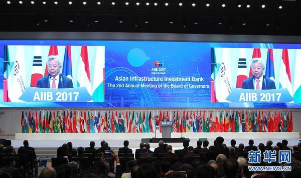 【第三次“吸粉”】2017年6月16日,亞投行宣布其理事會(huì)已批準(zhǔn)3個(gè)新意向成員加入,分別為阿根廷、馬達(dá)加斯加和湯加。至此,亞投行成員總數(shù)擴(kuò)至80個(gè)。圖為2017年6月16日,韓國(guó)濟(jì)州,亞投行第二屆年會(huì)開幕式現(xiàn)場(chǎng)。