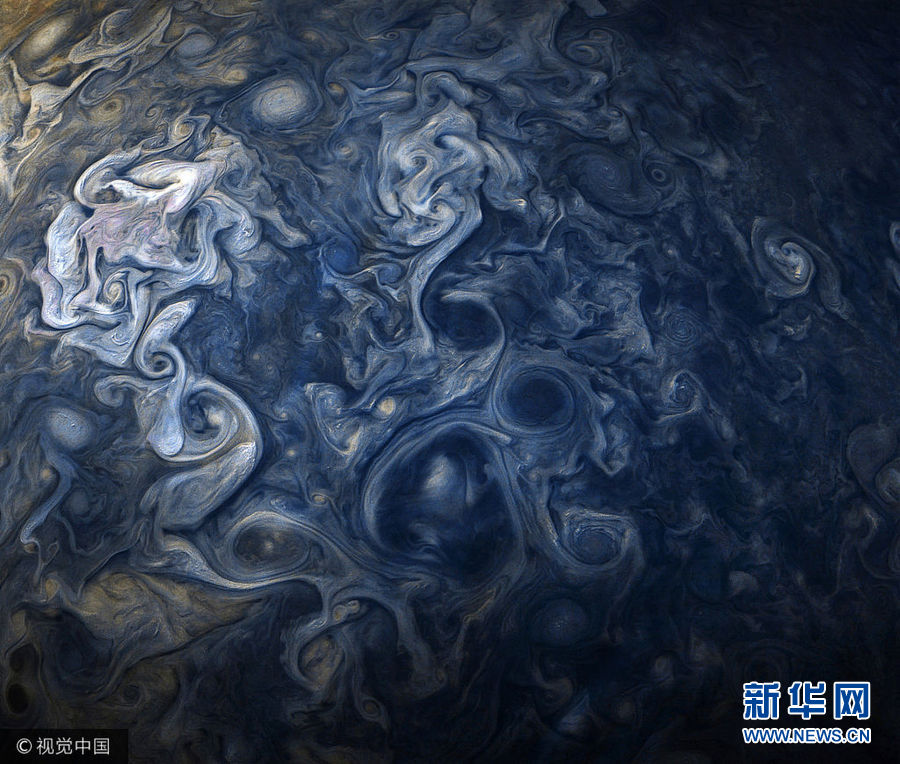 12月21日訊(具體拍攝時(shí)間不詳),這一系列由木星探測(cè)器“朱諾”號(hào)帶來(lái)的高清圖,錯(cuò)綜復(fù)雜的星云結(jié)構(gòu)看上去就像印象派大師的畫(huà)作。(圖片來(lái)源:視覺(jué)中國(guó))
