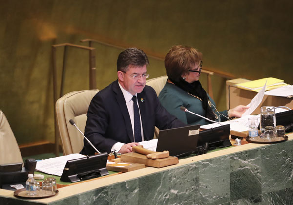 12月21日,在位于紐約的聯(lián)合國總部,第72屆聯(lián)合國大會(huì)主席萊恰克(左)主持聯(lián)合國大會(huì)緊急會(huì)議。新華社記者王迎攝