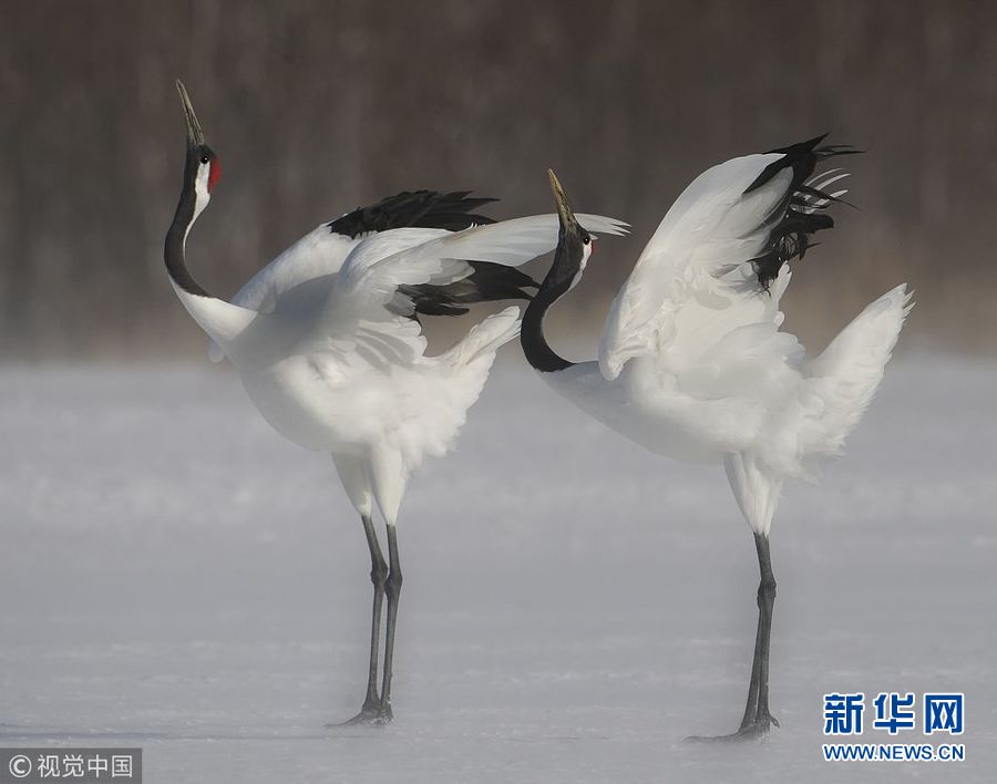 12月25日訊(具體拍攝時(shí)間不詳),日本北海道,一對(duì)丹頂鶴在冰面上翩翩起舞,動(dòng)作驚人一致。(圖片來(lái)源:視覺中國(guó))