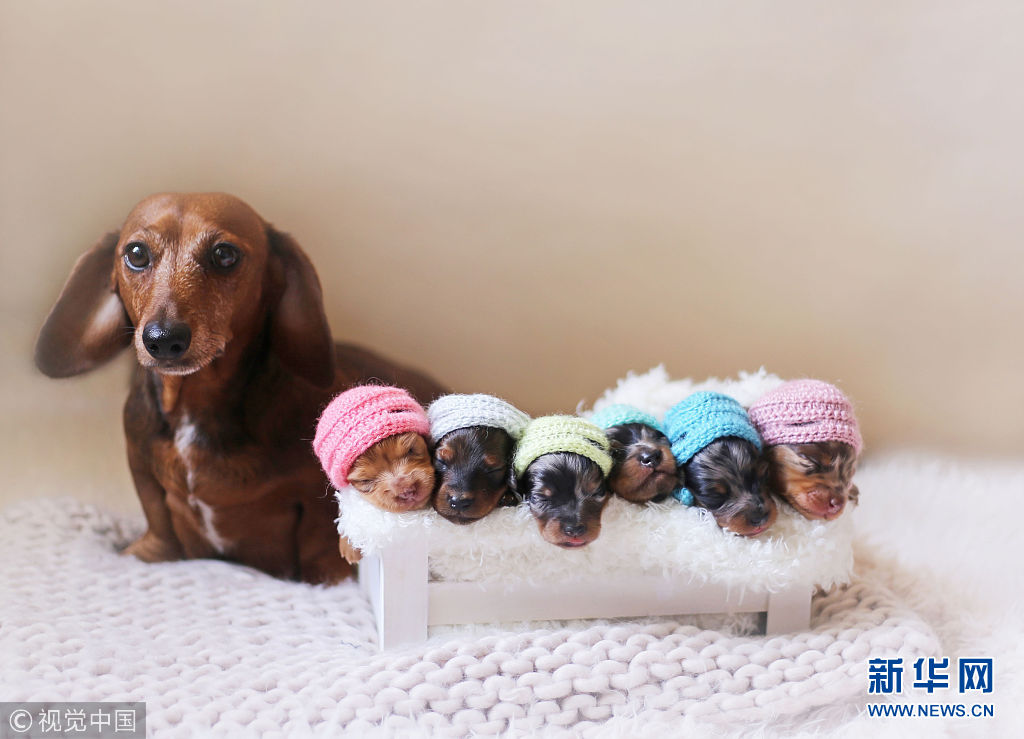 2016年6月12日消息(具體拍攝時(shí)間不詳),美國德克薩斯州麥卡倫市,商業(yè)攝影師Belinda Schenk為一對(duì)臘腸犬和他們剛出生的6只寶寶拍了一組別出心裁的唯美寫真。(圖片來源:視覺中國)