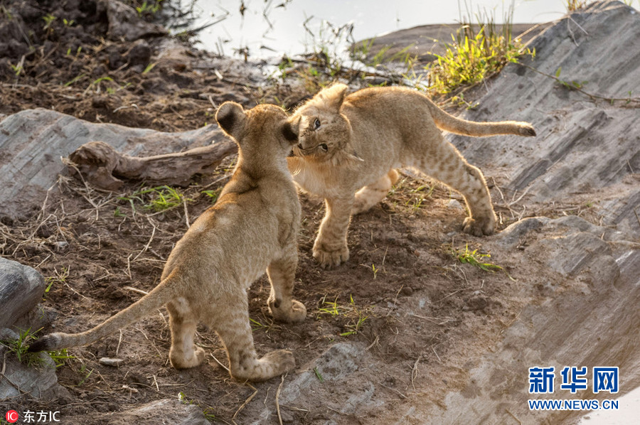 1月2日?qǐng)?bào)道(具體拍攝時(shí)間不詳),肯尼亞馬賽馬拉國家保護(hù)區(qū),64歲的攝影師Ingo Gelach在當(dāng)?shù)嘏臄z到一組有趣又暖心的照片。畫面中,兩頭小獅子站在水邊,似乎正考慮跨越面前的水域。其中一頭獅子用前腳搭在同伴的肩膀上,似乎在表達(dá)友好,又似是在鼓勵(lì)同伴不要害怕,勇敢地跨過去。(圖片來源:東方IC)