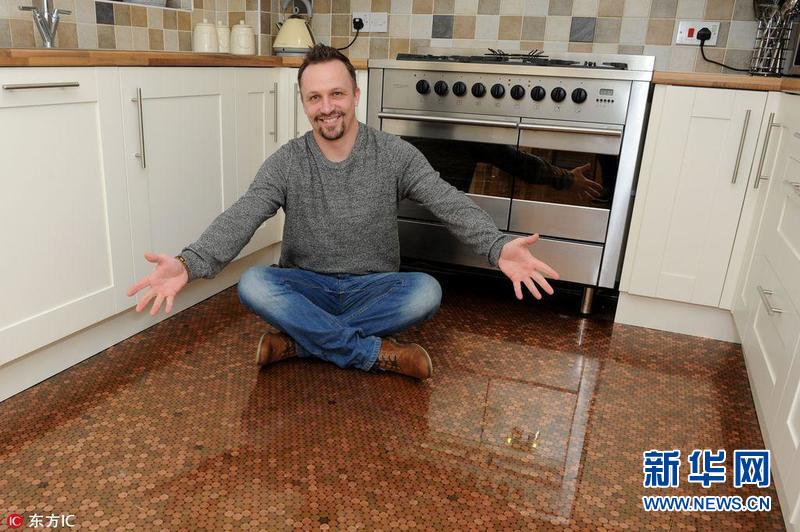 【酷!銅幣廚房】2017年2月4日,來自英國特爾福德的Matt Giles用一便士硬幣當(dāng)瓷磚,共用2.7萬枚銅幣打造出了自己夢寐以求的廚房地面。