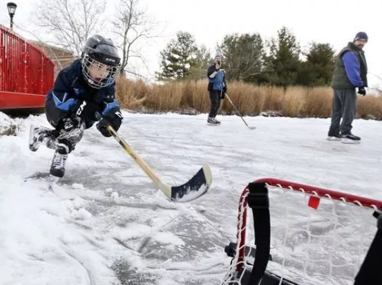 人們?cè)诮Y(jié)了冰的池塘上面打冰球