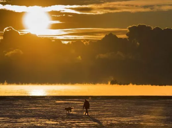 在冰凍的湖面上遛狗,竟然有一種油畫(huà)般的詩(shī)意美呢。