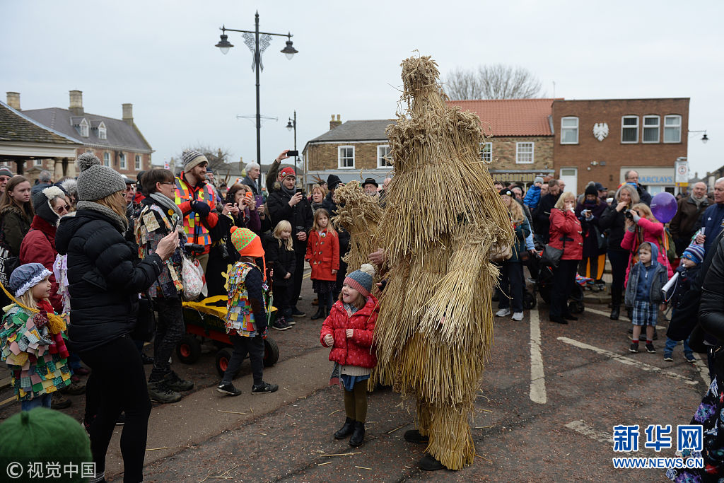 英國小鎮(zhèn)慶?!暗静菪堋惫?jié) 民眾跟隨草人盡情舞動