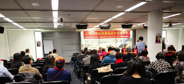 當(dāng)?shù)貢r(shí)間20日下午,近百名旅居德國法蘭克福的華人在德國法蘭克福機(jī)場舉行會(huì)議,為首位競選法蘭克福市市長的德國華人楊明先生吶喊助威,組織選票。