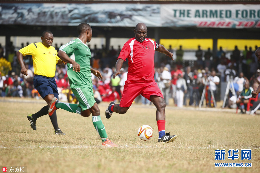 1月20日,利比里亞首都蒙羅維亞,利比里亞當(dāng)選總統(tǒng)、前世界足球先生喬治-維阿參加慈善足球比賽,率領(lǐng)維阿全明星隊(duì)對(duì)戰(zhàn)利比里亞武裝部隊(duì)士兵隊(duì)。喬治-維阿在去年12月27日當(dāng)選利比里亞新一任總統(tǒng),并將于2018年1月22日就職。(圖片來源:東方IC)