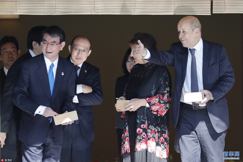 當?shù)貢r間2018年1月27日,日本東京,日本外相河野太郎接待到訪的法國外長讓·伊夫·勒德里昂及其夫人,帶其參觀赤坂宮,體驗喂魚。(圖片來源:東方ic)