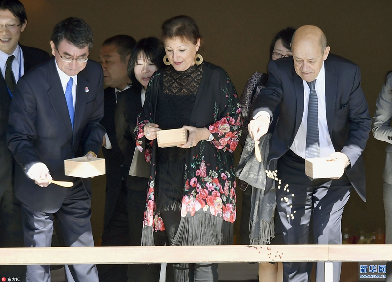 當(dāng)?shù)貢r(shí)間2018年1月27日,日本東京,日本外相河野太郎接待到訪的法國外長讓·伊夫·勒德里昂及其夫人,帶其參觀赤坂宮,體驗(yàn)喂魚。(圖片來源:東方ic)