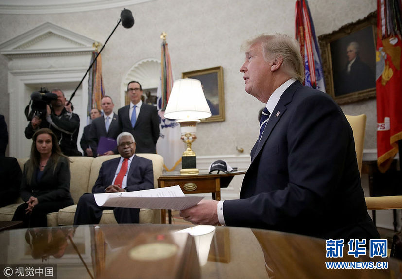 當(dāng)?shù)貢r間1月31日,美國華盛頓,美國總統(tǒng)特朗普在白宮與公司雇員討論稅收改革問題。(圖片來源:視覺中國)