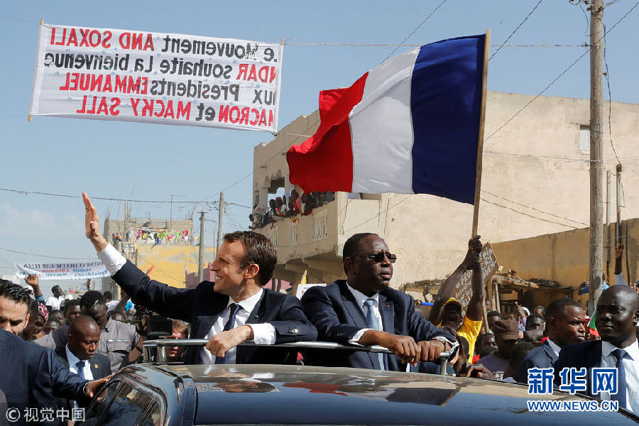 當(dāng)?shù)貢r(shí)間2月3日,塞內(nèi)加爾圣路易,塞內(nèi)加爾總統(tǒng)馬基·薩勒陪到訪的法國(guó)總統(tǒng)馬克龍?jiān)煸L當(dāng)?shù)?,兩人乘車向民眾致意。(圖片來(lái)源:視覺(jué)中國(guó))